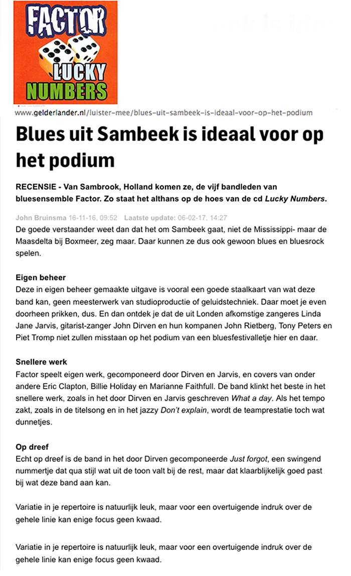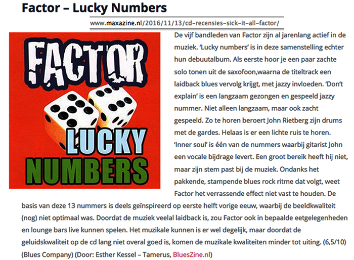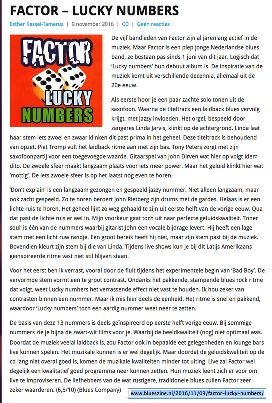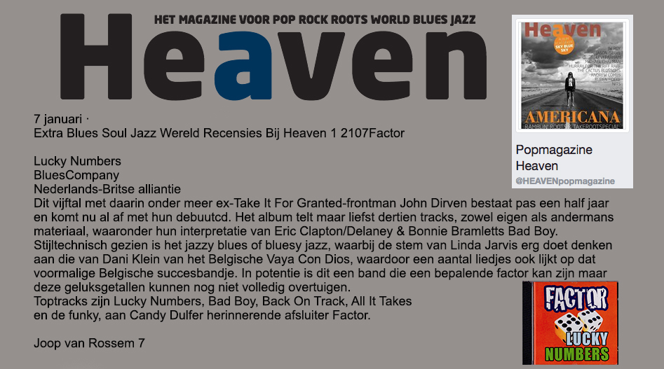 .....................many many times, Oor, Stage, Aardschok, Rif Raf, Big Twin, Mind View, Revu, Eindhovens Dagblad, Friesch Dablad, Groot Eindhoven, Haarlemmermeers Dagblad, Helmonds Dagblad, Traverse, Block, Jassepoes, Hendrixfanclub Germany, Udens Weekblad, Oostbrabant, Gitaar Plus, Gitarist, Volkskrant, Panorama, Alles op Tien,Travers, Aloha,de Sleutel Oss), Tubantia (Twente), de Brug, Leeuwarder Courant, Groovemaster, Dagblad Zaanstreek, Back to the Roots, Metal Maidens, Rockgirl, Kindamuzik, BV Popkrant, Bobtjeblues, Blues Das deutsche Bluesmagazin, Music in Belgium, Brabants Dagblad, Dienblad, Alternative ways, Track, De Stem, Backline, Brabant Pop, Musicmaker, Moors Magazine, GEZIEN-GEHOORD.NL, Blueszine, Maxazine, de Gelderlander, Popmagazine Heaven, Festivalinfo, File Under, Tubantia and lots of local papers, alone or in combination with Take it for granted, Netty Driessen, Rosa King, Rob Hoeke, Sander Boes, Ben van de Wal, Bertus Borgers, Walter Trout, Ana Popovic, Jesse Gang, Ritchie Severijns, Eamonn Mccormack, Rob Snijders, Fred Hoogendoorn, Sjoerd van Bommel, Hans Dulfer, Peter van Schadewijk, Iwan Wijnen, Tony Peters, Bonki Bongaerts, Thijs van Leer, John Lagrand, Nicko Christiansen and many many more and lots of radio, local, national